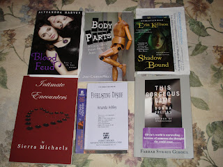 These are books I received for review: Blood Feud, Body Parts and Intimate Encounters. I received Shadow Bound from an author contest. The Gorgeous Game is for a book tour. And Everlasting Desire was submitted to me signed from the fabulous Amanda Ashley! I love her dark vampire romance!